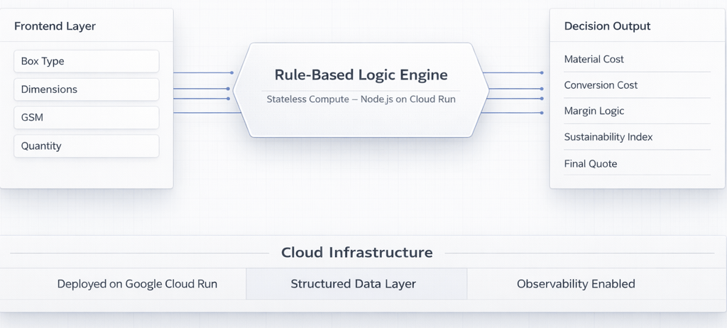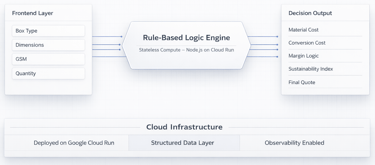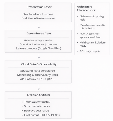 The system enforces deterministic pricing and feasibility validation logic — evaluating material constraints, structural rules, and margin thresholds before quotation release.