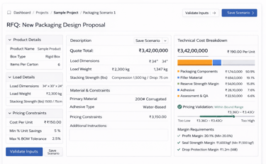 PackGPT converts unstructured packaging enquiries into machine-readable decision inputs — including dimensions, materials, quantities, and constraints — ready for deterministic validation.